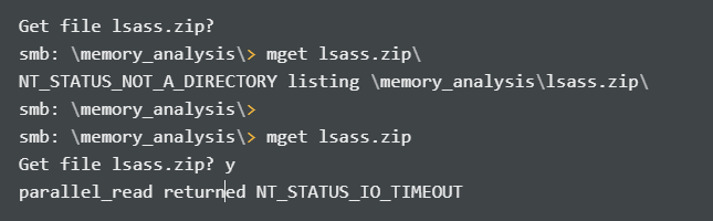 These credentials don’t work. These files are from the computer forensic analysis. This shows that the Administrator user was compromised and its password was changed to that. Remember that these files are from a computer forensic investigation, so these files are from a previous state of the machine. There are interesting files on the forensic share. One interesting file is the lsass.zip file, which most likely contains a dump of the lsass.exe process when the extraction was done. When I tried to download it, I encountered some issues: