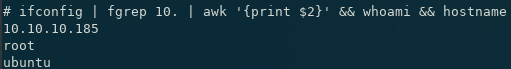 $ ifconfig | fgrep 10. | awk '{print $2}' && whoami && hostname