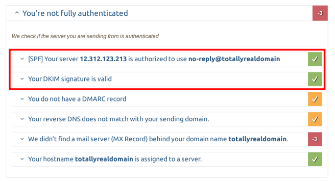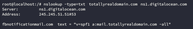 I wont go in depth with SPF record’s syntax, but this record basically means that only domains listed under the A record that defines mail.totallyrealdomain.com should pass the SPF check.