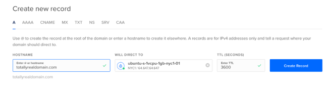 After that, you’ll have to configure digitaloceans DNS servers to point your domain to the newly created vps’s IP.