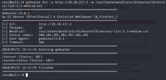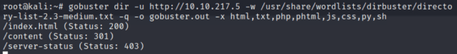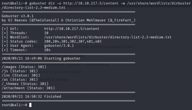 Additionally, what we can do is to use gobuster tool again to find the hidden directories within the directory we already found ‘content’