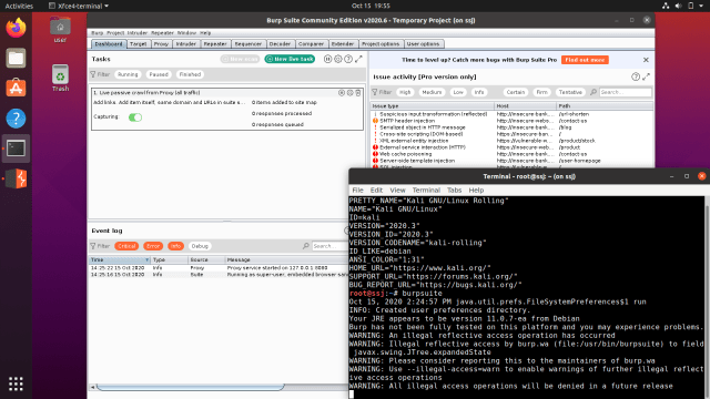 SSJ is a Docker image that uses kalilinux/kali as the base image and installs google-chrome, firefox-esr, sublime-text, tmux, kali-linux-large, etc. packages. It uses the kali.download/kali mirror and kali-last-snapshot branch. It also allows you to run GUI applications like Burpsuite, Wireshark, Ettercap, etc. from within the container on your everyday Linux distribution using --privileged docker capabilities and --net=host argument. This script builds the image and creates a .desktop file (the Application Launcher) for you. So, the only thing you need to do is, find SSJ in you aplicaiton drawer/menu and click on it to launch it. An xfce4-terminal will popup with all your pentesting and infosec tools in it. Execute burpsuite to fire up the proxy, firefox to fire up the browser and like that, you have access to hundreds of tools and packages that are there in Kali Linux (particularly the kali-linux-large metapackage), right on your everyday Linux distribution.