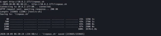 - Let’s escalate further to get the root flag. We can use LinPEAS for privilege escalation. You can start a python local server or apache2 and download the file into the machine shell.