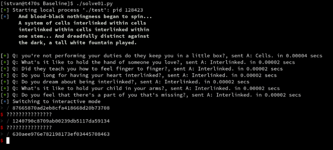 We have the super fast lookup table in the form of an sqlite db, so nothing can stop us to build the final solution script with pwntools.