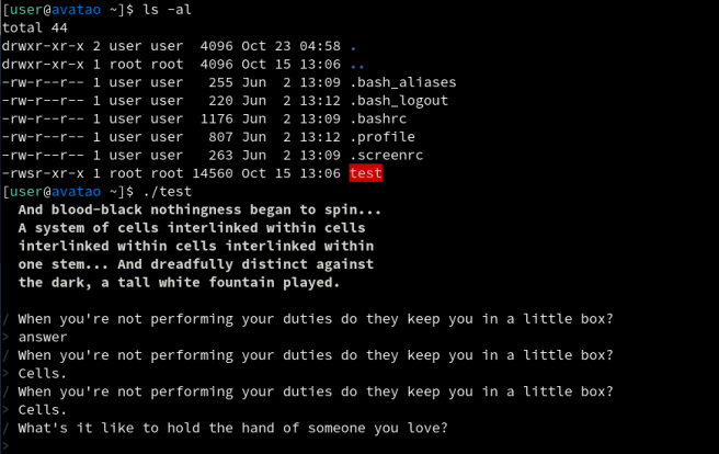 Accessing the challenge was provided by SSH (cmdline was included in the challenge description), and in the container there was a SUID binary called “test” what was actually the challenge. Running the binary test starts asking questions: