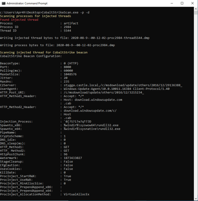 CobaltStrikeScan scans Windows process memory for evidence of DLL injection (classic or reflective injection) and performs a YARA scan on the target process’ memory for Cobalt Strike v3 and v4 beacon signatures.