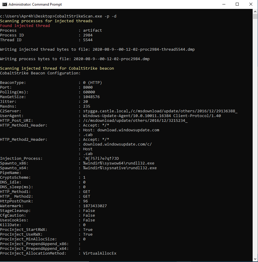 If a Cobalt Strike beacon is detected in the file or process, the beacon’s configuration will be parsed and displayed to the console.