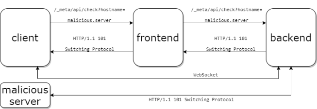 We can see that the metadata server uses socket.io to communicate via WebSockets with the app-secret server. Furthermore, the metadata server contains an open-redirect endpoint /_meta/api/check?hostname=xy to send check requests to the hostname (used internally for checking the public and secret server).