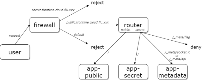 In the next step, the Nginx router forwards the request to the public, private, or metadata server, depending on the subdomain and the path. The path /_meta/flag, which obviously gives us the flag, is denied.