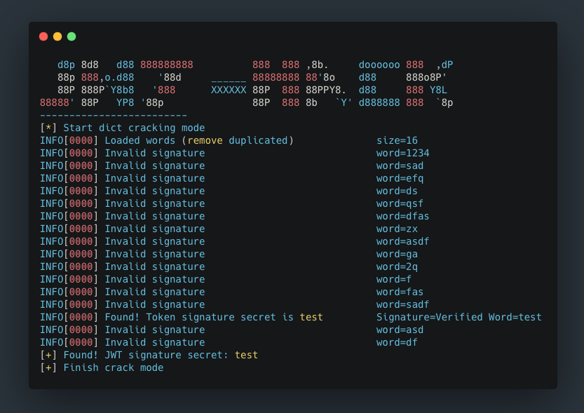 INFO[0000] Found! Token signature secret is test Signature=Verified Word=test