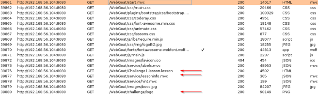 Burp History will reveal the full extent of the loading process, of all these things, the ones highlighted in red arrows are loaded specifically for this challenge, the other seems to be shared between all of WebGoat (but this does not really mean anything though)