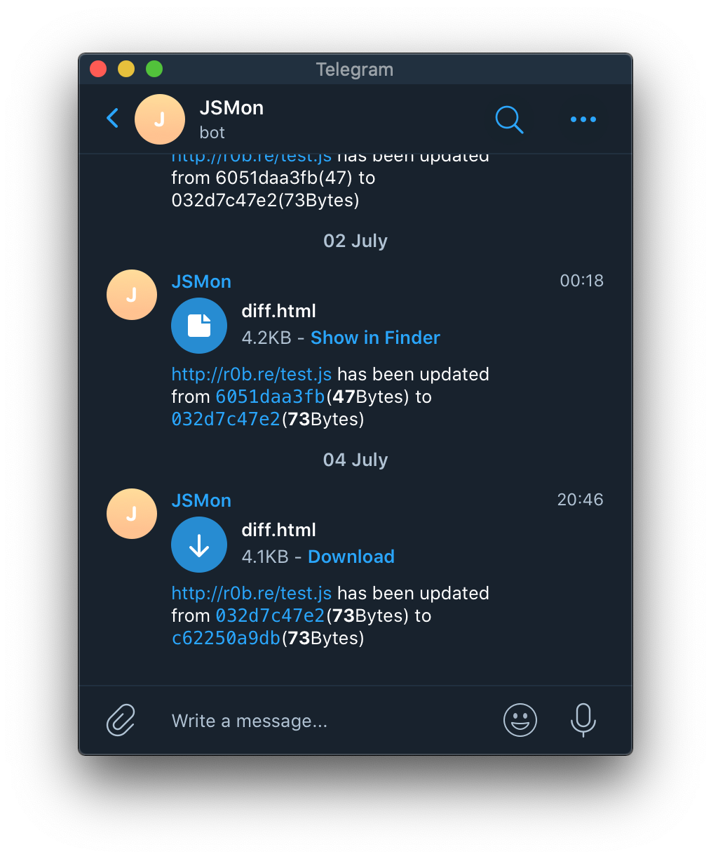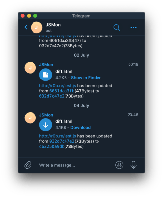 Using this script, you can configure a number of JavaScript files on websites that you want to monitor. Everytime you run this script, these files will be fetched and compared to the previously fetched version. If they have changed, you will be notified via Telegram with a message containing a link to the script, the changed filesizes, and a diff file to inspect the changes easily.