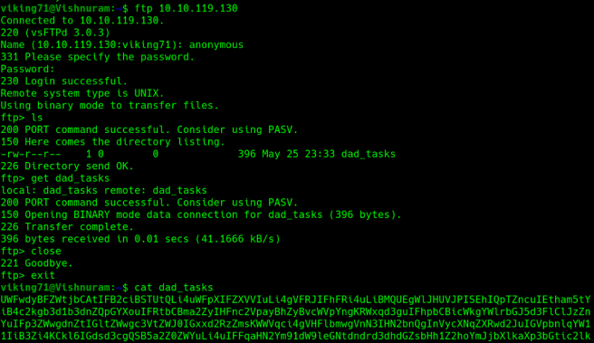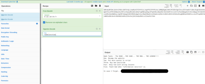 4. We can see a file called “dad_tasks” with a string that looks encoded. After many different tries, I was able to decode the string using CyberChef. First, with base64 and then with Vigenere cipher. Then finally, we will get Weston’s password.