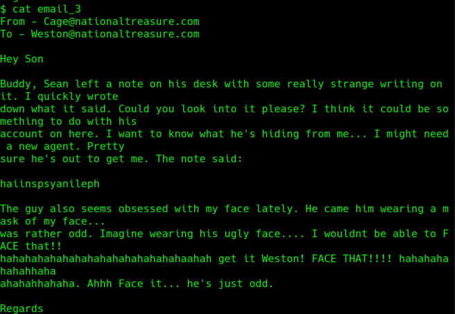 10. In the ‘email_backup’ folder, there are three emails. The third email gives us a note which looks encrypted.